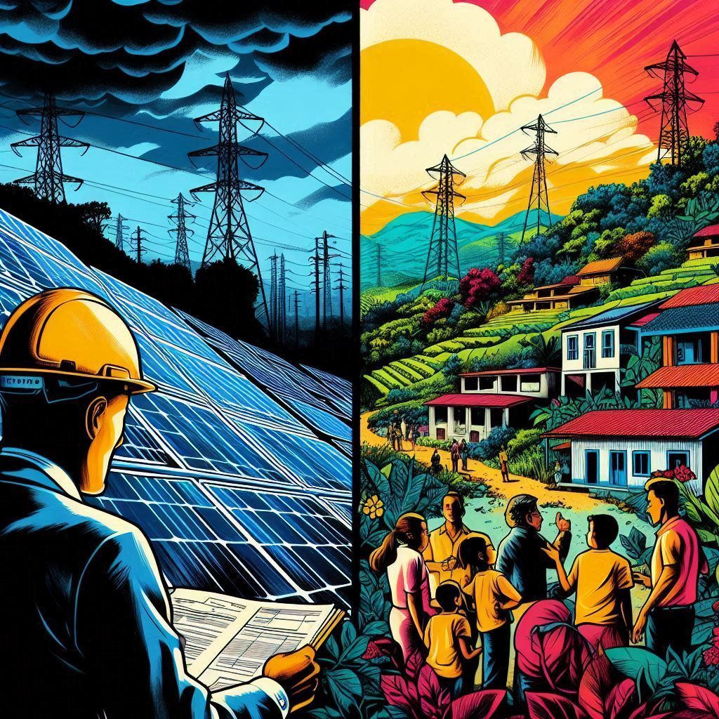 This AI-generated image illustrates tensions in Puerto Rico’s energy transition. It references the DOE’s withdrawal of $365M in solar funds, local co-op efforts, LUMA’s new backup power program, and González’s proposed energy reforms.